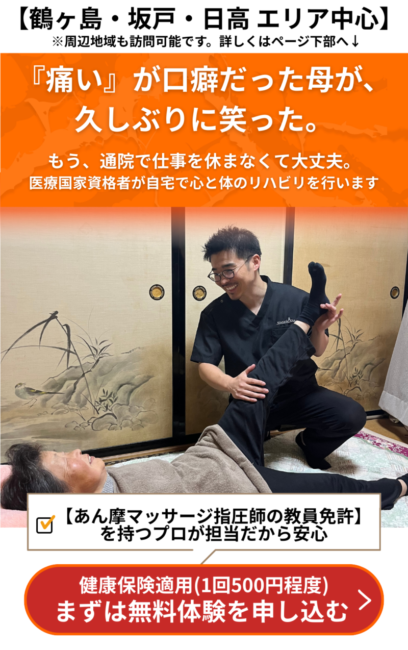 訪問マッサージは、国家資格である「あん摩マッサージ指圧師」の有資格者から在宅で受けられるマッサージ治療です。病気・障害・高齢などの理由でお一人での通院が難しく『痛み・麻痺・拘縮・体の機能低下・筋力低下』などでお困りの方へ、痛みの緩和・筋力機能維持へと導くマッサージ・機能訓練を提供しております。費用は介護保険ではなく医療保険が適用できます。